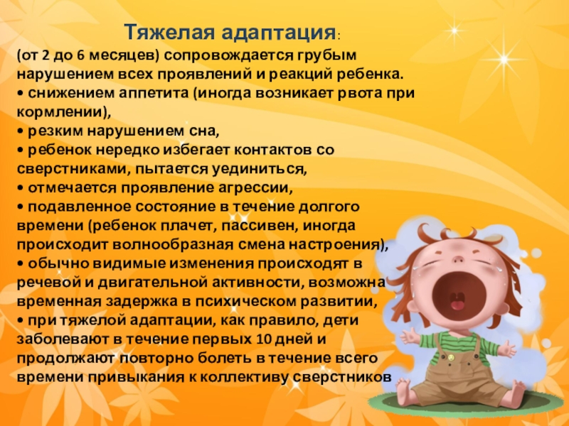 • при тяжелой адаптации, как правило, дети заболевают в течение первых 10 дней и продолжают повторно болеть в течение всего времени привыкания к коллективу сверстников