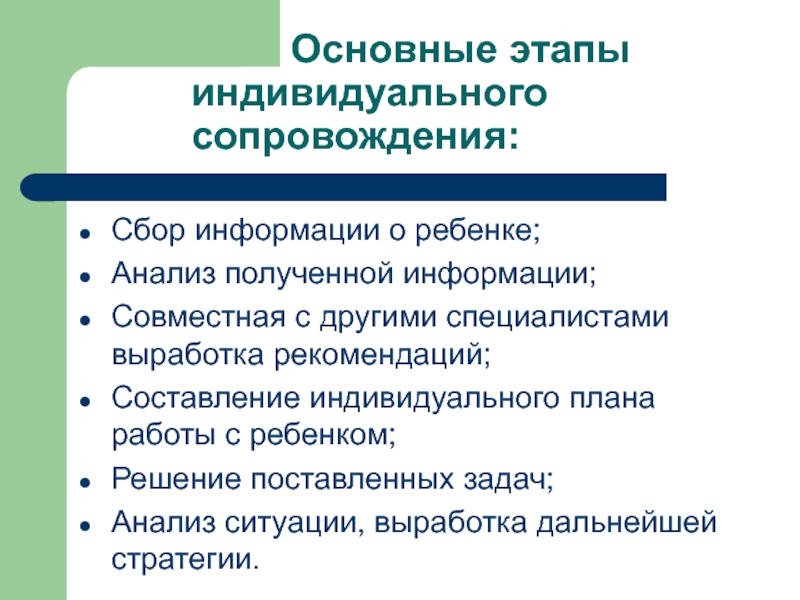 Составление индивидуального плана работы с ребенком;