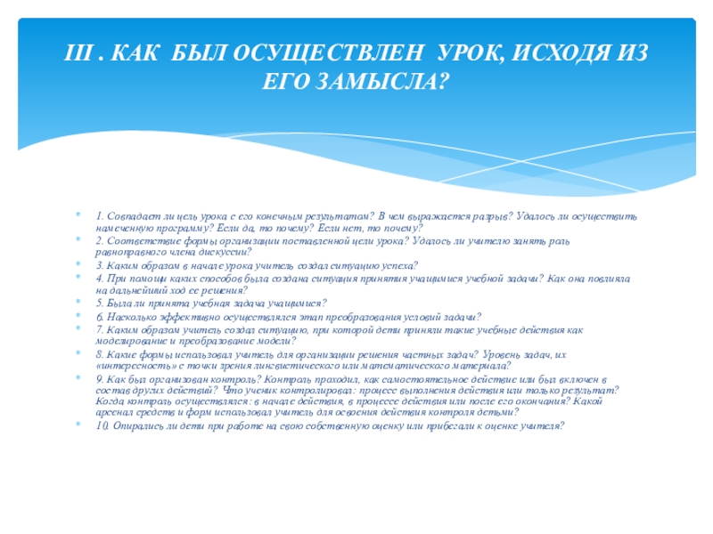 III . КАК БЫЛ ОСУЩЕСТВЛЕН УРОК, ИСХОДЯ ИЗ ЕГО ЗАМЫСЛА?