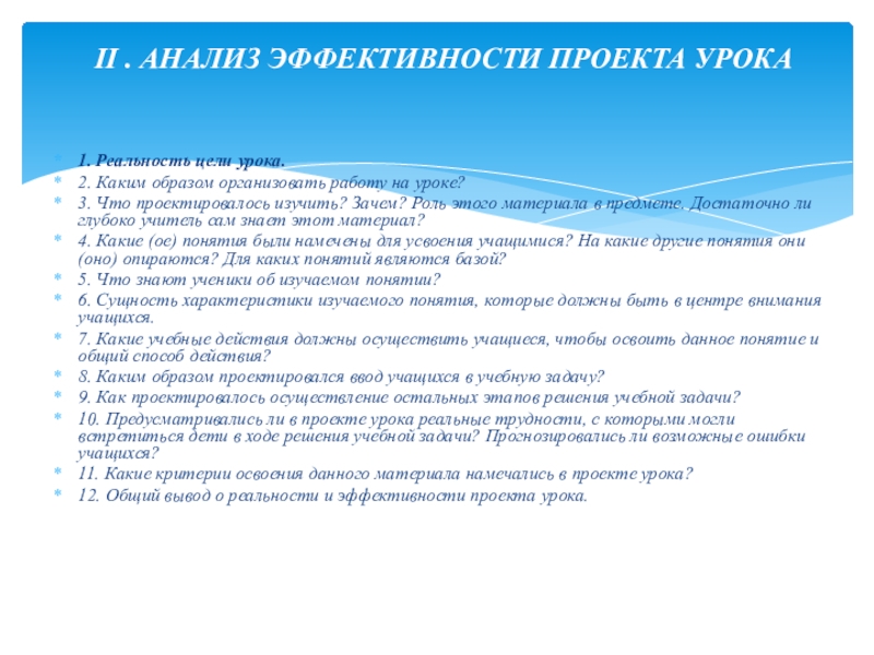 II . АНАЛИЗ ЭФФЕКТИВНОСТИ ПРОЕКТА УРОКА