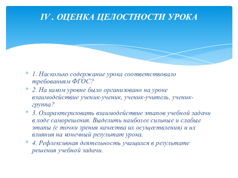 IV . ОЦЕНКА ЦЕЛОСТНОСТИ УРОКА
