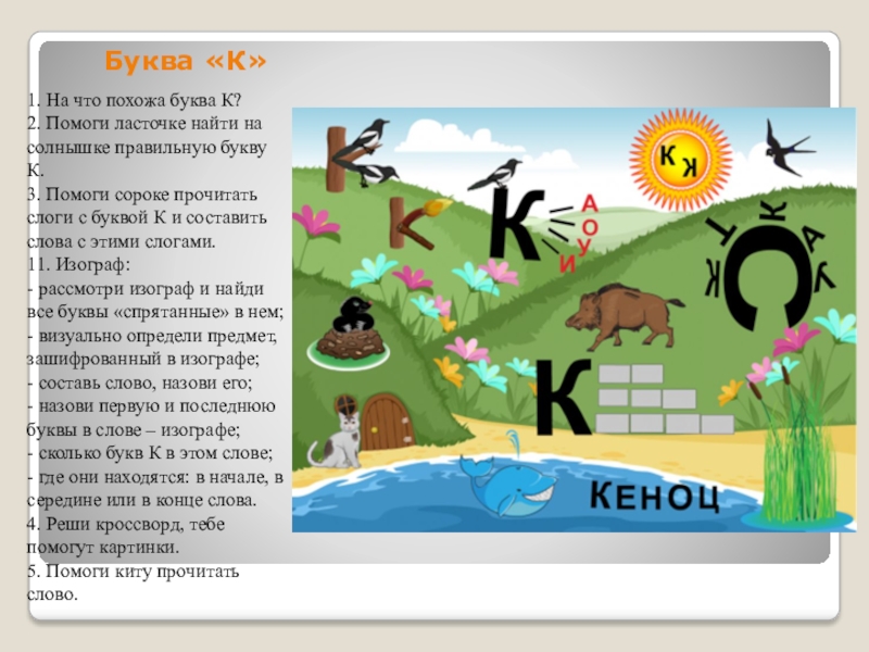 Буква «К»1. На что похожа буква К? 2. Помоги ласточке найти на солнышке правильную букву К. 3. Помоги сороке прочитать слоги с буквой К и составить слова с этими слогами. 11. Изограф: - рассмотри изограф и