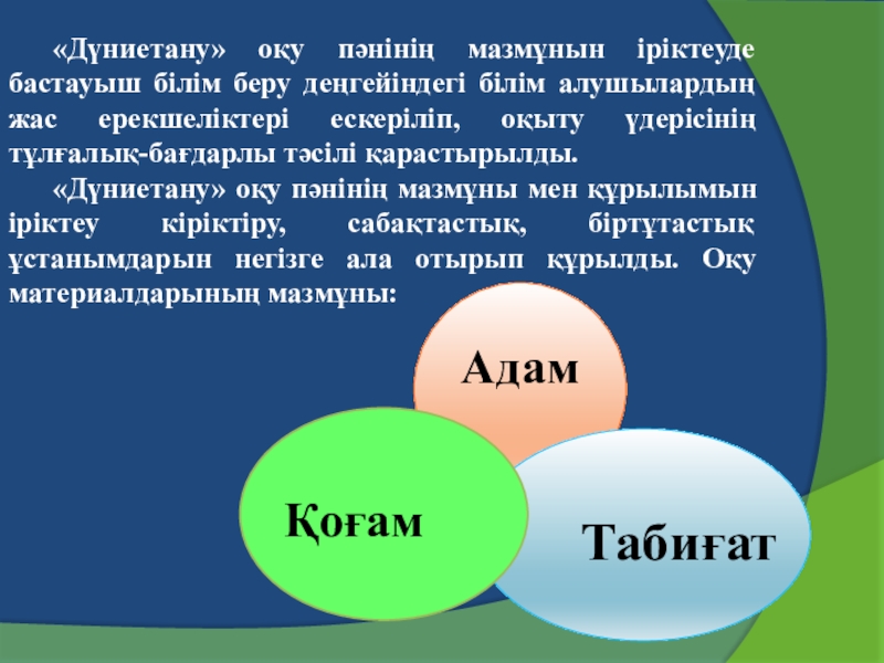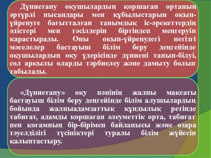 «Дүниетану» оқу пәнінің мазмұнын іріктеуде бастауыш білім беру деңгейіндегі білім алушылардың жас ерекшеліктері ескеріліп, оқыту үдерісінің тұлғалық-бағдарлы