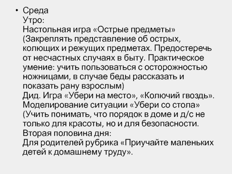 Дид. Игра «Убери на место», «Колючий гвоздь». Моделирование ситуации «Убери со стола» (Учить понимать, что порядок в доме и д/с не только для красоты, но и для безопасности.