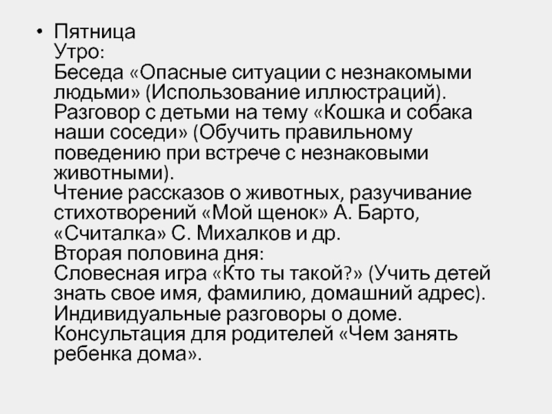 тему «Кошка и собака наши соседи» (Обучить правильному поведению при встрече с незнаковыми животными).