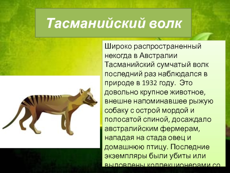 Широко распространенный некогда в Австралии Тасманийский сумчатый волк последний раз