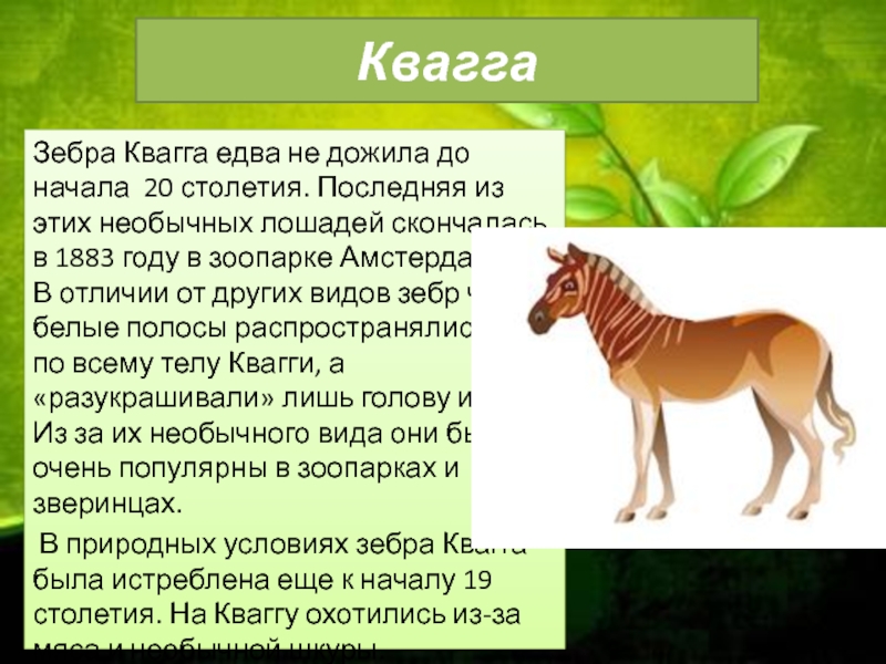 В природных условиях зебра Квагга была истреблена еще к началу 19 столетия. На Кваггу охотились из-за мяса и необычной шкуры.