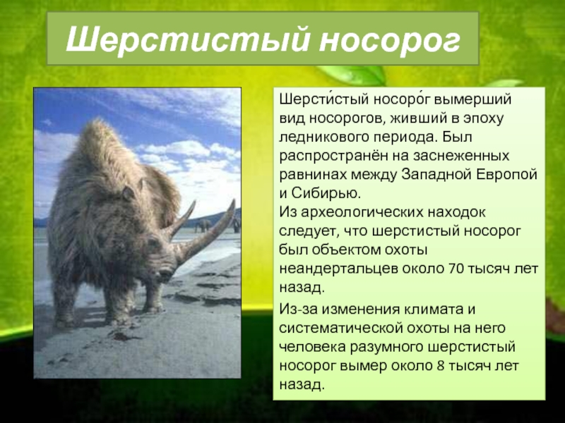 Из-за изменения климата и систематической охоты на него человека разумного шерстистый носорог вымер около 8 тысяч лет назад.