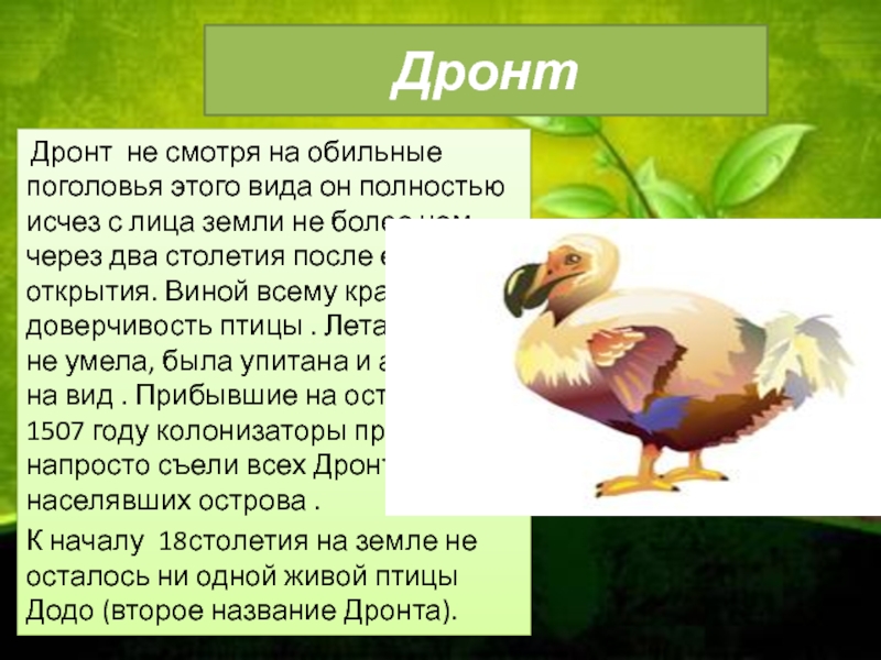К началу 18столетия на земле не осталось ни одной живой птицы Додо (второе название Дронта).