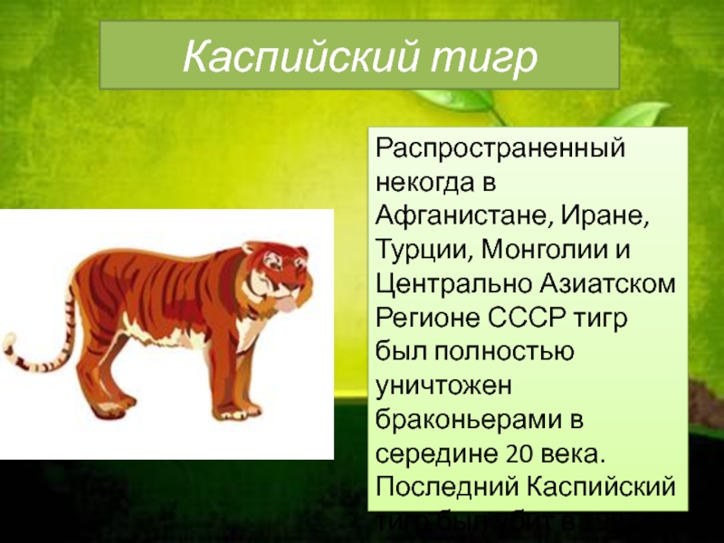 Регионе СССР тигр был полностью уничтожен браконьерами в середине 20 века.