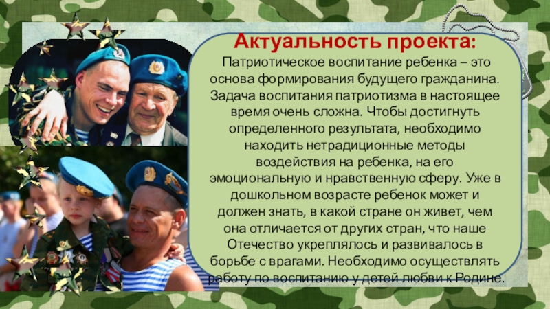Задача воспитания патриотизма в настоящее время очень сложна. Чтобы достигнуть определенного результата, необходимо находить нетрадиционные методы воздействия на ребенка, на его эмоциональную и нравственную сферу. Уже в дошкольном возрасте ребенок может и должен знать, в какой стране он живет, чем она отличается от других стран, что наше Отечество укреплялось и развивалось в борьбе с врагами. Необходимо осуществлять работу по воспитанию у детей любви к Родине.