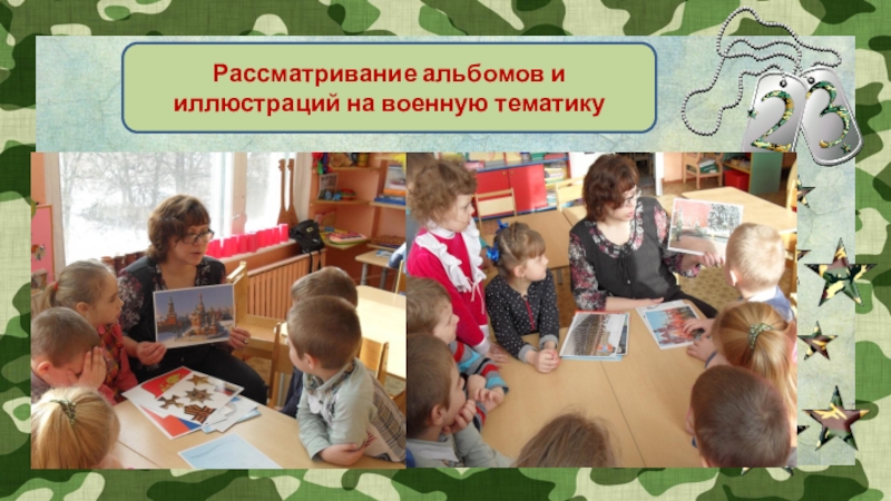 Слайд 15Рассматривание альбомов и иллюстраций на военную тематику