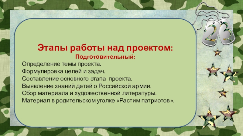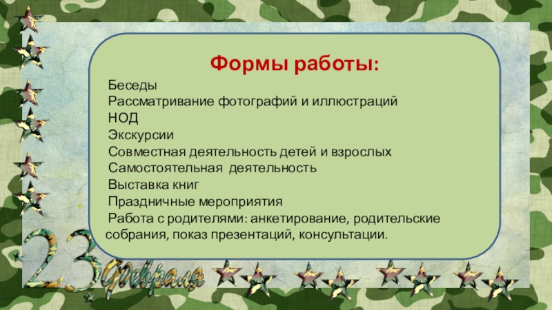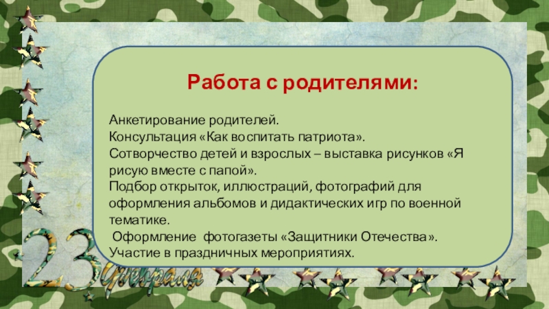 3. Проводить работу с родителями, привлекая их к патриотическому воспитанию детей в семье.
