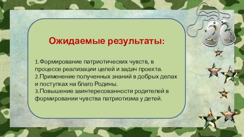 1.Формирование патриотических чувств, в процессе реализации целей и задач