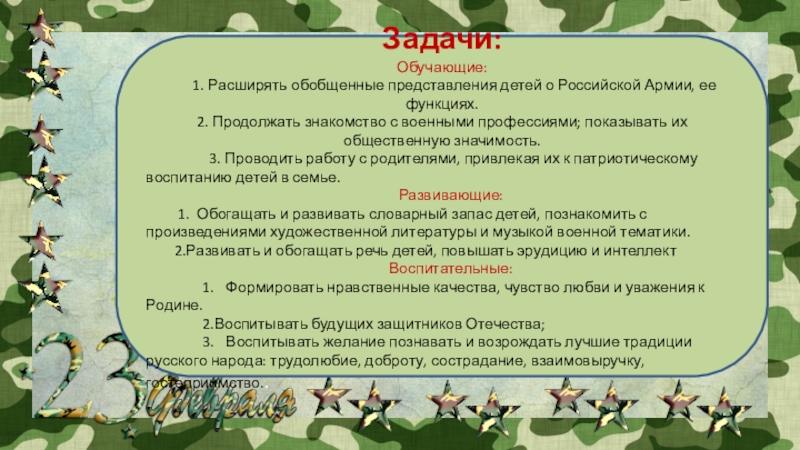 2. Продолжать знакомство с военными профессиями; показывать их общественную значимость.