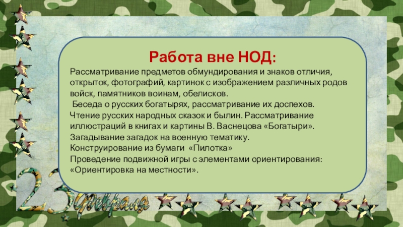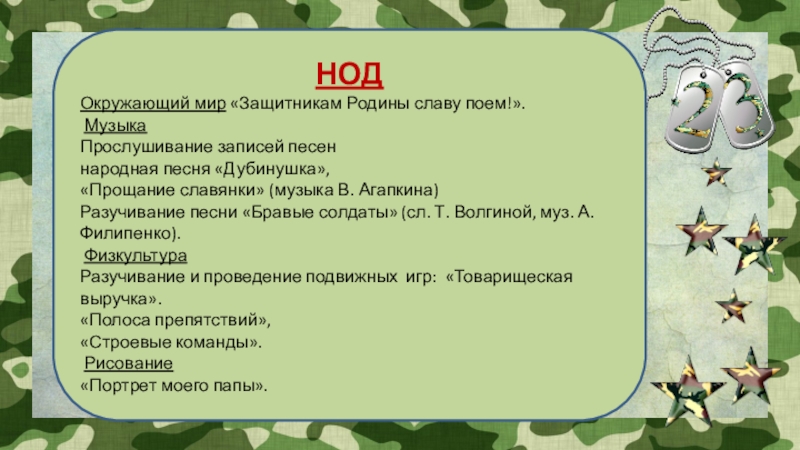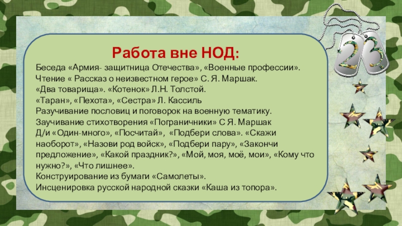 Д/и «Один-много», «Посчитай», «Подбери слова». «Скажи наоборот», «Назови род войск», «Подбери пару», «Закончи предложение», «Какой праздник?», «Мой, моя, моё, мои», «Кому что нужно?», «Что лишнее».