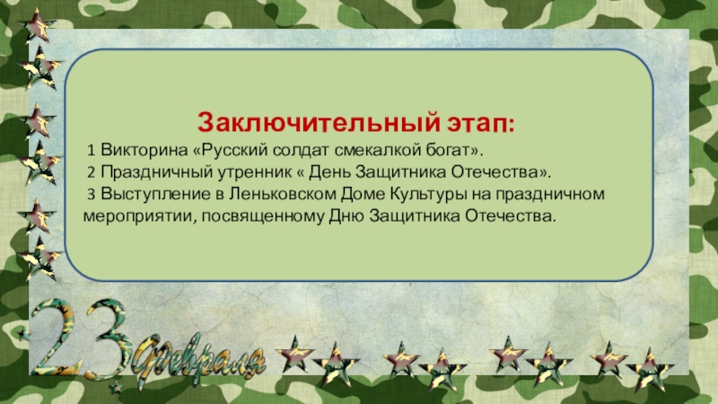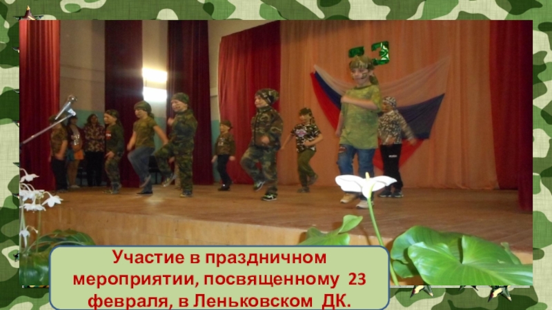 Слайд 33Участие в праздничном мероприятии, посвященному 23 февраля, в Леньковском ДК.