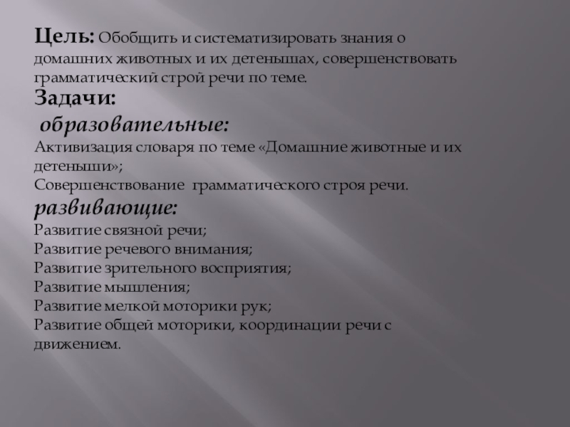 Активизация словаря по теме «Домашние животные и их детеныши»;