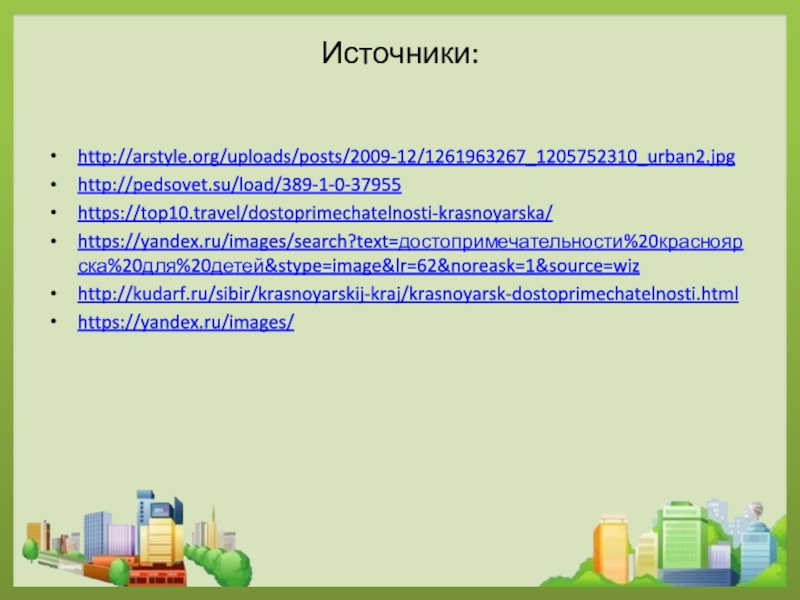 Источники:http://arstyle.org/uploads/posts/2009-12/1261963267_1205752310_urban2.jpghttp://pedsovet.su/load/389-1-0-37955https://top10.travel/dostoprimechatelnosti-krasnoyarska/https://yandex.ru/images/search?text=достопримечательности%20красноярска%20для%20детей&stype=image&lr=62&noreask=1&source=wizhttp://kudarf.ru/sibir/krasnoyarskij-kraj/krasnoyarsk-dostoprimechatelnosti.htmlhttps://yandex.ru/images/