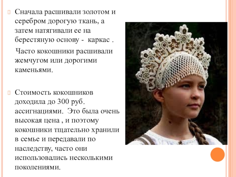 Стоимость кокошников доходила до 300 руб. ассигнациями. Это была очень высокая цена , и поэтому кокошники тщательно хранили в семье и передавали по наследству, часто они использовались несколькими поколениями.