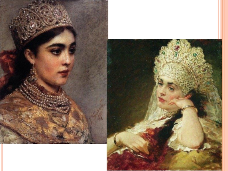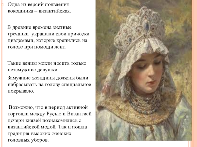 Возможно, что в период активной торговли между Русью и Византией дочери князей познакомились c византийской модой. Так и пошла традиция высоких женских головных уборов.