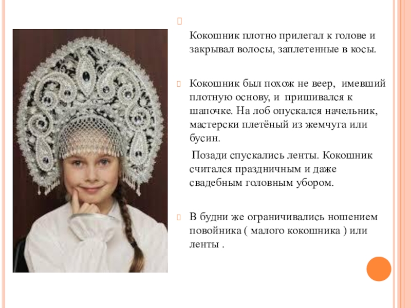 Кокошник плотно прилегал к голове и закрывал волосы, заплетенные в косы.