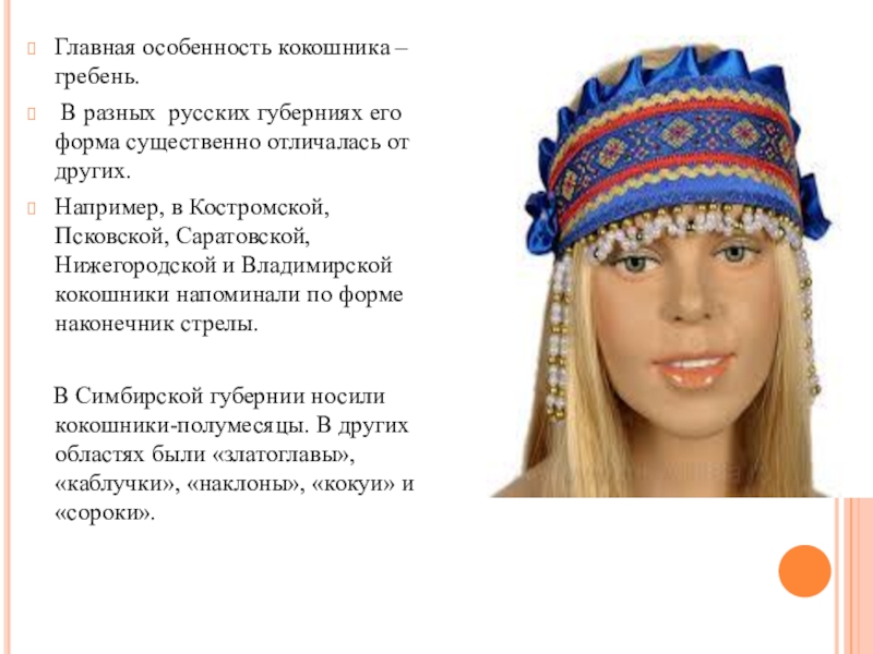 Например, в Костромской, Псковской, Саратовской, Нижегородской и Владимирской кокошники напоминали по форме наконечник стрелы.