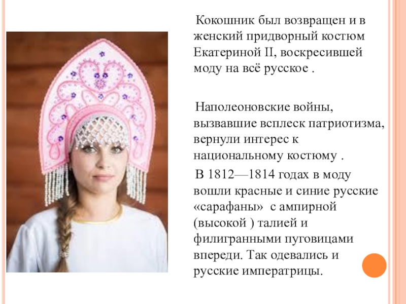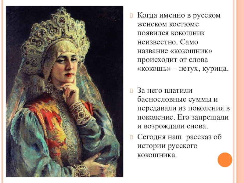 Слайд 3Когда именно в русском женском костюме появился кокошник неизвестно. Само название
