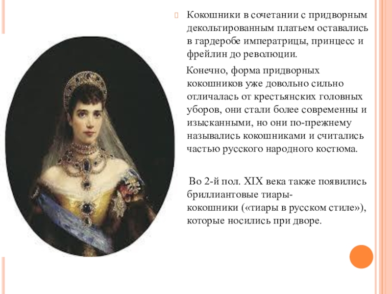 Во 2-й пол. XIX века также появились бриллиантовые тиары-кокошники («тиары в русском стиле»), которые носились при дворе.