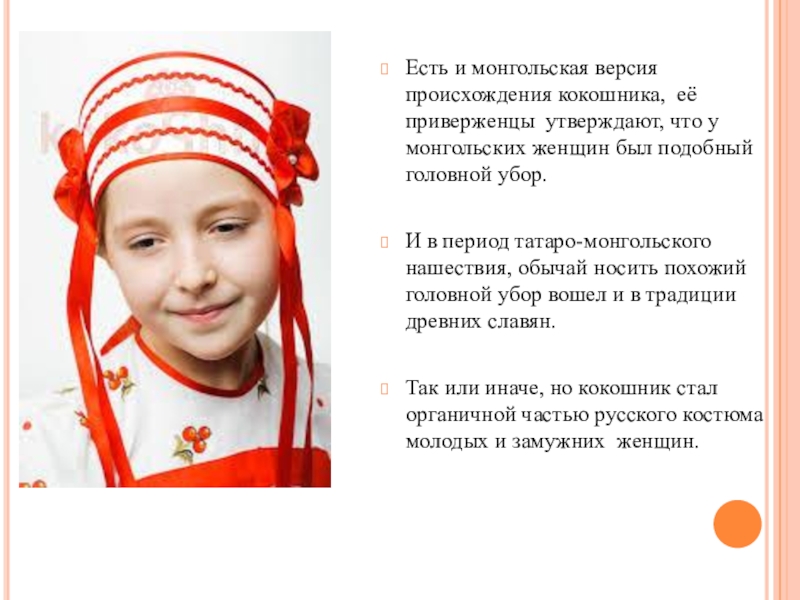 Слайд 7Есть и монгольская версия происхождения кокошника, её приверженцы утверждают, что у