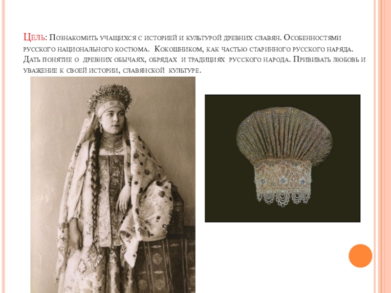 национального костюма. Кокошником, как частью старинного русского наряда. Дать понятие о древних обычаях, обрядах и традициях русского народа. Прививать любовь и уважение к своей истории, славянской культуре.