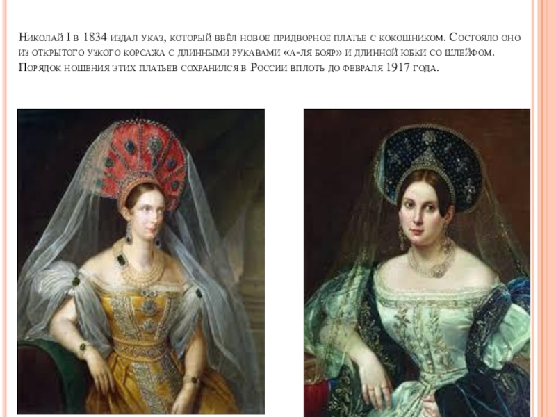 Слайд 18Николай I в 1834 издал указ, который ввёл новое придворное платье