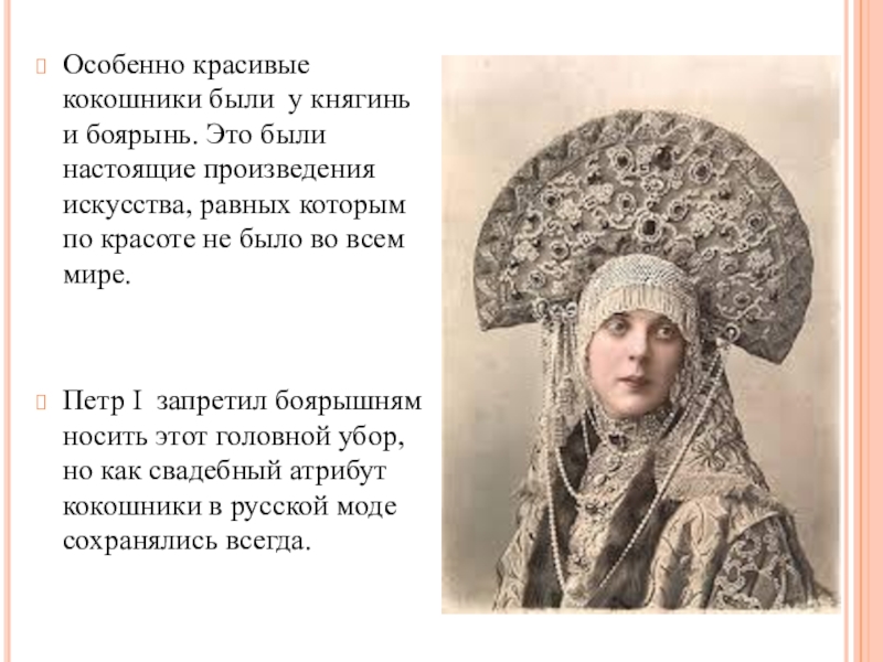 Петр I запретил боярышням носить этот головной убор, но как свадебный атрибут кокошники в русской моде сохранялись всегда.