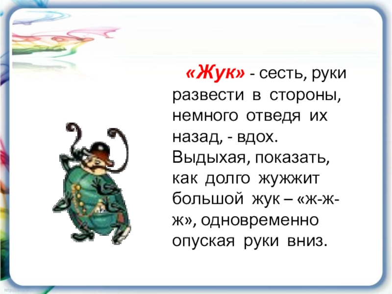 их назад, - вдох. Выдыхая, показать, как долго жужжит большой жук – «ж-ж-ж», одновременно опуская руки вниз.