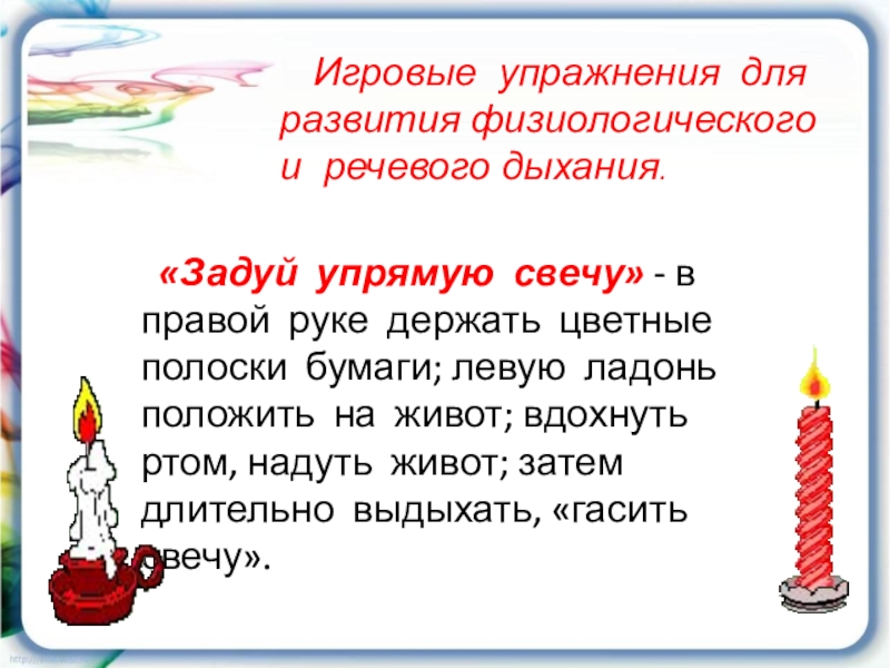 «Задуй упрямую свечу» - в правой руке держать цветные полоски бумаги; левую ладонь положить на живот; вдохнуть ртом, надуть живот; затем длительно выдыхать, «гасить свечу».