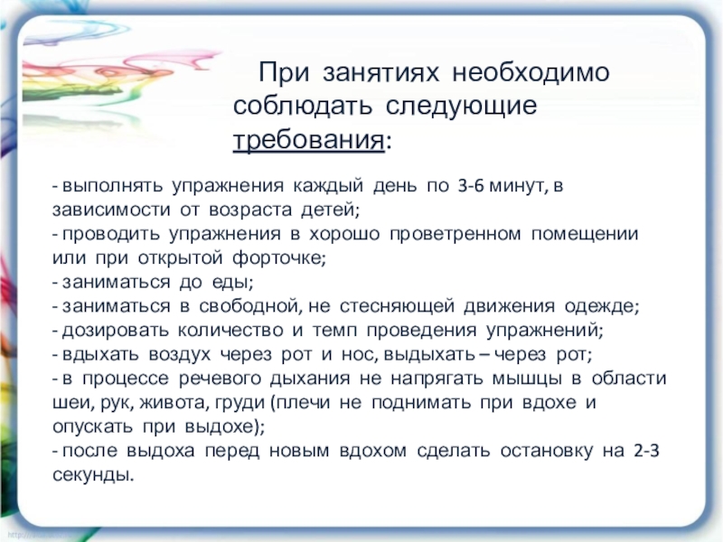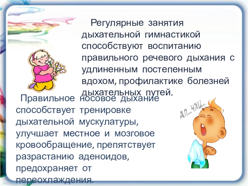 Слайд 2 Регулярные занятия дыхательной гимнастикой способствуют воспитанию правильного речевого дыхания