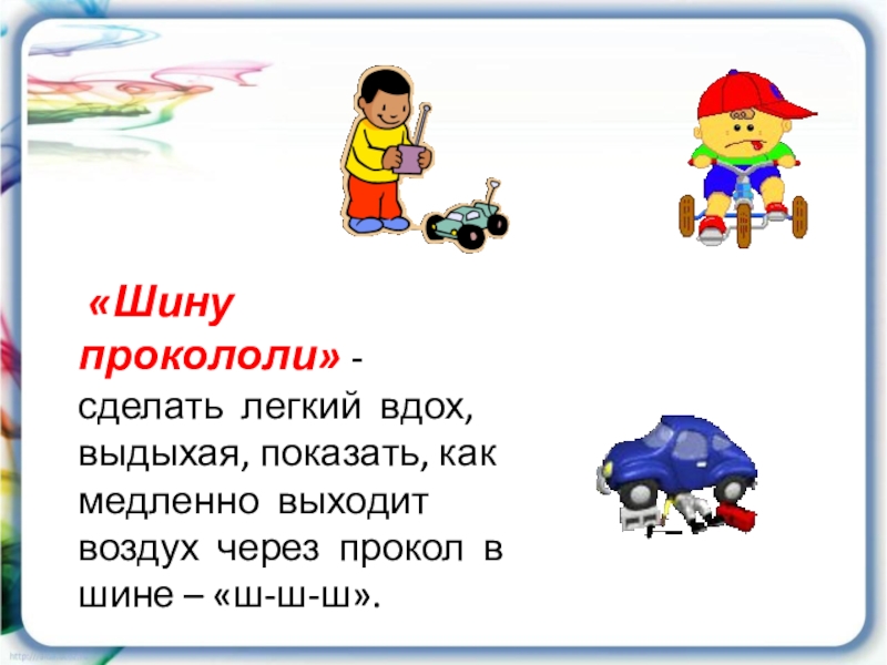 Слайд 20 «Шину прокололи» - сделать легкий вдох, выдыхая, показать, как медленно