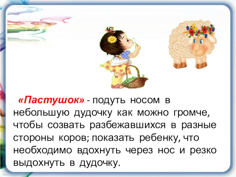 Слайд 7 «Пастушок» - подуть носом в небольшую дудочку как можно громче,