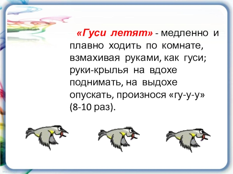 взмахивая руками, как гуси; руки-крылья на вдохе поднимать, на выдохе опускать, произнося «гу-у-у» (8-10 раз).