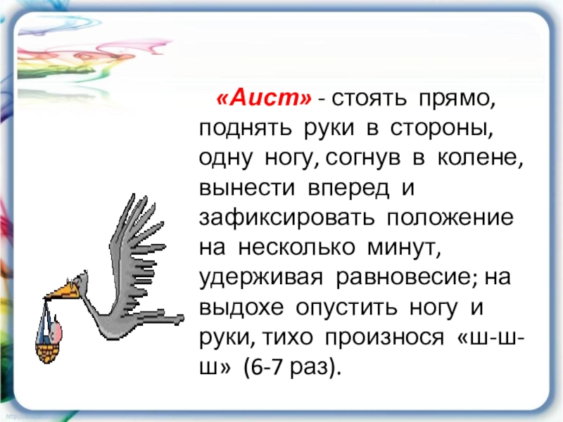 Слайд 10 «Аист» - стоять прямо, поднять руки в стороны, одну