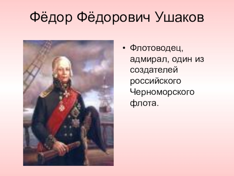 Фёдор Фёдорович УшаковФлотоводец, адмирал, один из создателей российского Черноморского флота.
