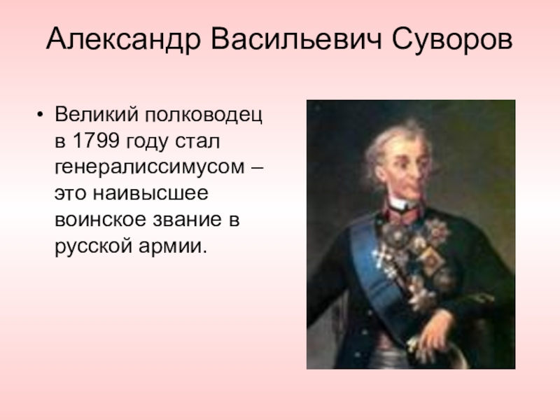 Александр Васильевич СуворовВеликий полководец в 1799 году стал генералиссимусом – это наивысшее воинское звание в русской армии.