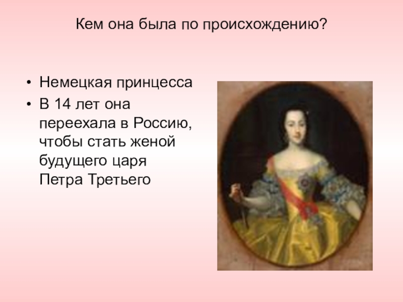 Кем она была по происхождению?Немецкая принцессаВ 14 лет она переехала в Россию, чтобы стать женой будущего царя