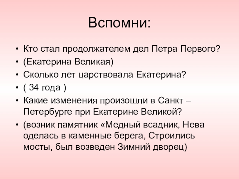 Вспомни:Кто стал продолжателем дел Петра Первого?(Екатерина Великая)Сколько лет царствовала Екатерина?( 34 года )Какие изменения произошли в Санкт