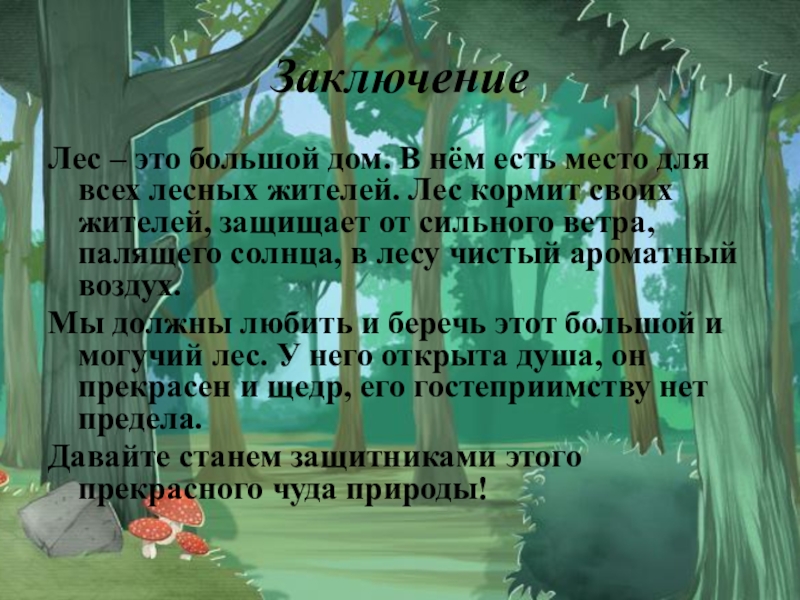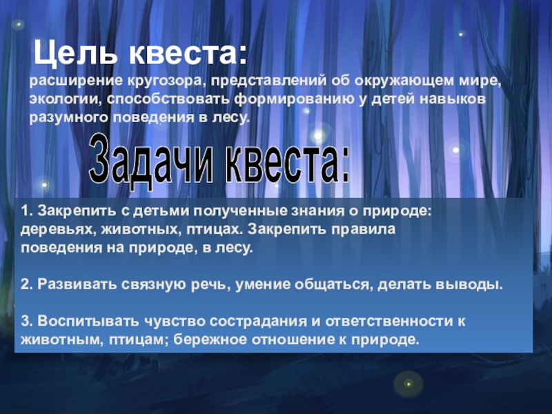 расширение кругозора, представлений об окружающем мире, экологии, способствовать формированию у детей навыков разумного поведения в лесу.