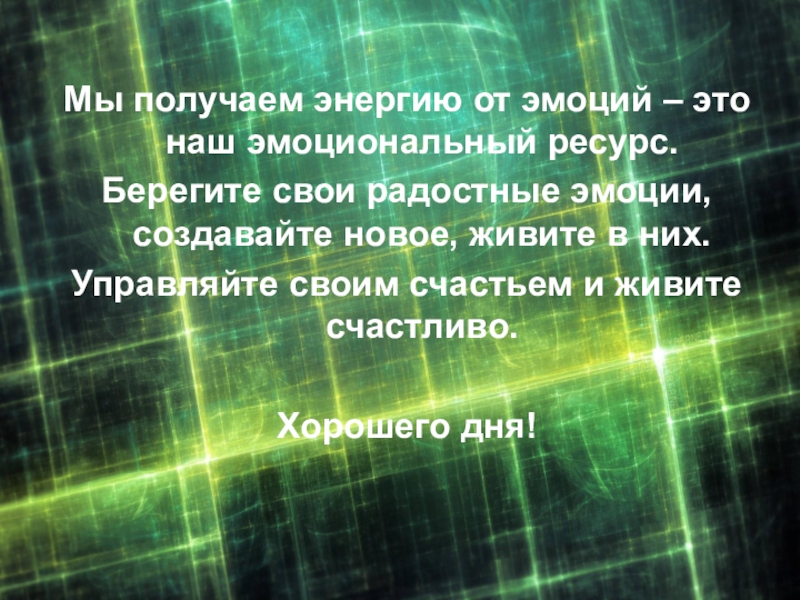 Мы получаем энергию от эмоций – это наш эмоциональный ресурс. Берегите свои радостные эмоции, создавайте новое, живите