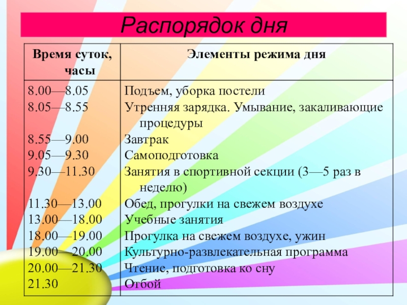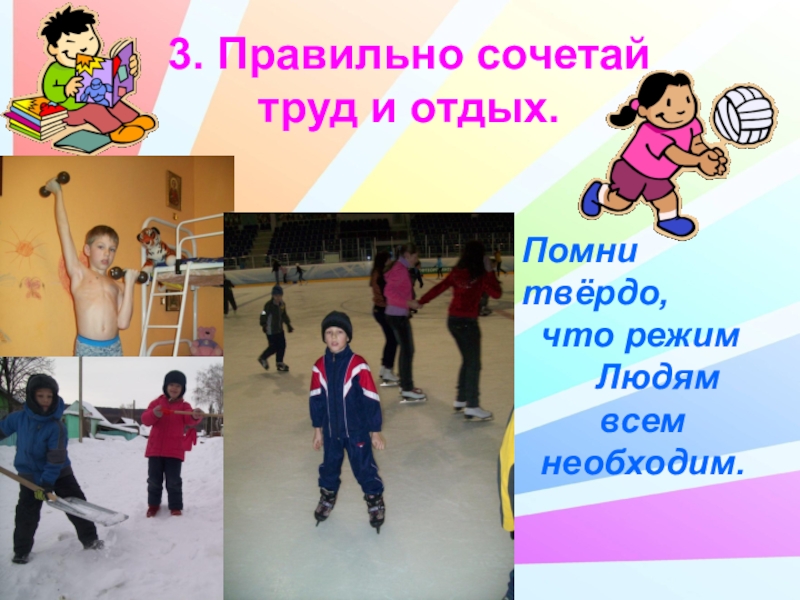 3. Правильно сочетай труд и отдых.Помни твёрдо, что режим  Людям всем необходим.