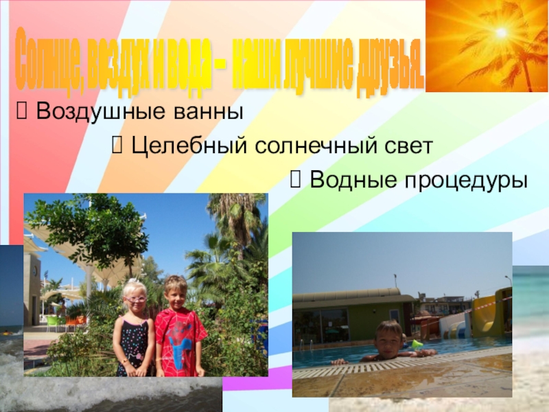 Воздушные ванны Целебный солнечный свет Водные процедурыСолнце, воздух и вода – наши лучшие друзья.