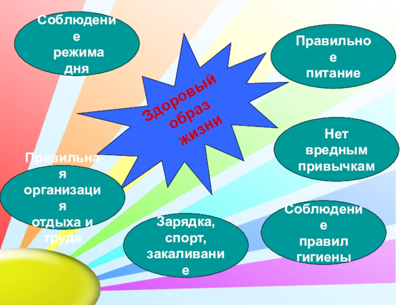 Здоровый образ жизниПравильноепитаниеСоблюдение режима дняПравильнаяорганизацияотдыха и трудаЗарядка,спорт,закаливаниеСоблюдениеправил гигиеныНет вреднымпривычкам