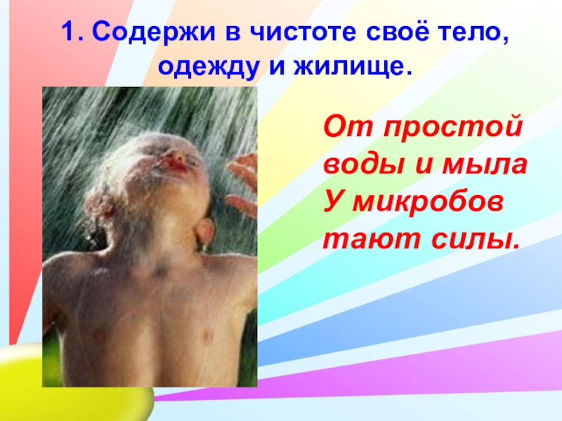 1. Содержи в чистоте своё тело, одежду и жилище.От простой воды и мылаУ микробов тают силы.